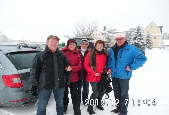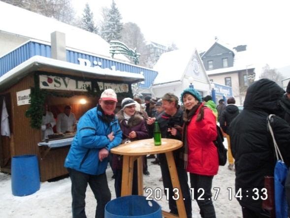 Am nächsten Tag war der Besuch des Lauschaer Kugelmarktes geplant, zu dem wir mit unseren Gastgebern fuhren. Wir konnten Glasbläsern bei der Arbeit zusehen, es gaben drinnen wie draußen im ganzen Ort jede Menge Glaskunst zu bestaunen und auch ein kleines Mitbringsel haben wir gefunden. Die Thüringer Rostbratwurst und der Glühwein fehlten natürlich nicht und ebenso trug die Winterlandschaft zur weihnachtlichen Stimmung bei.Auch die Chefin des Jenaer Clubs Christine und ein weiteres Mitglied waren noch nach Lauscha gekommen. Beendet wurde der Abend bei einem gemütlichen Raclette-Essen bei unseren Gastgebern Hildrun und Günter zu Hause. Am Sonntag zeigten die beiden uns noch einige Plätze in der näheren Umgebung ihres Wohnortes, so z.B. eine Kanone von Napoleon und den Kurort Bad Klosterlausnitz mit seinen Kureinrichtungen. Danach traten wir gegen Mittag die Heimreise an und waren pünktlich zum Adventskaffee wieder zu Hause.