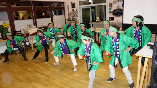 Bei der Farewell Party im Dörphus in Groß Rogahn ließen wir am Abend bei guter Stimmung die gemeinsame Woche ausklingen. Die Gäste überraschten uns mit „Nankin Tama Sudare“, einer traditionellen japanischen Performance mit lose gewebten Stöcken. Danach führten sie einen japanischen Tanz auf, bei dem später auch die Mitglieder unseres Clubs zum Mittanzen aufgefordert wurden.